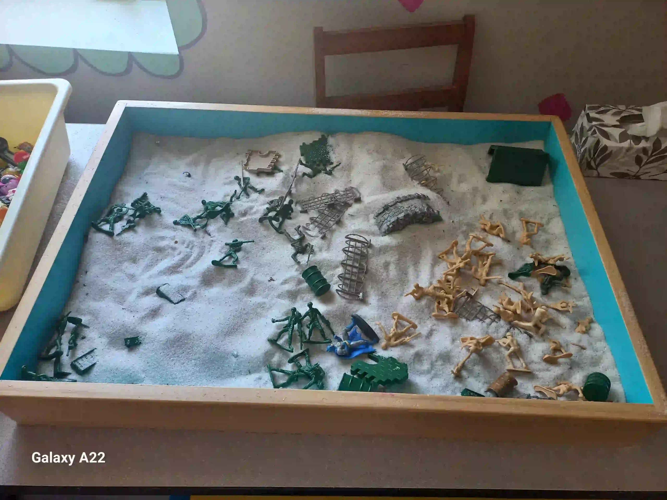 One of our favourite tools is Sandtray Therapy. Using miniature figures and a tray of sand, children can create scenes that reflect their inner world. This hands-on, sensory experience can help: